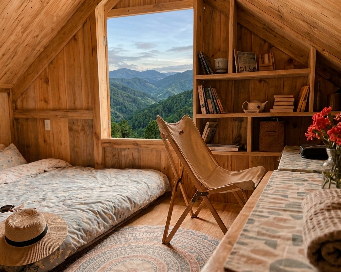 Tọa lạc tại vị trí cao nhất của homestay, nơi những cơn gió đại ngàn tự do ghé thăm. Hệ thống cửa sổ đón gió thông minh giúp bạn luôn cảm nhận được hơi thở mát lành của núi rừng và tiếng xào xạc của lá cây hòa thành bản nhạc du dương.